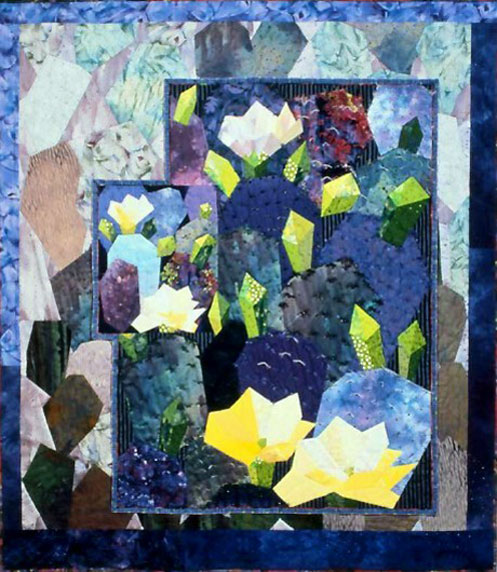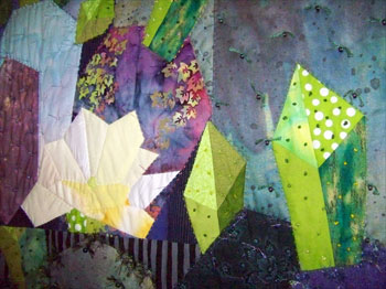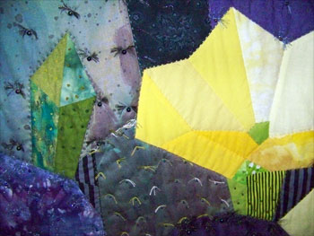 100% cottons, including commercial fabrics, hand dyes by Linelle McEntire, Lunn Fabrics and others, marbled, monoprint and batik fabrics by the artist. Machine pieced, hand appliquéed, machine and hand quilted and stitched, embellished with beads and decorative threads.