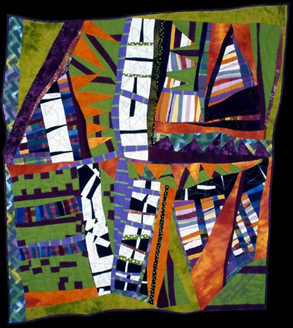 100% cottons. Machine pieced using no patterns or straight edges, hand quilted with perle cotton.