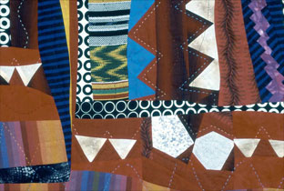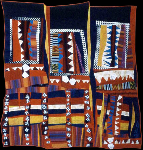 Original design inspired by a woman's loincloth crafted by the Akha tribe in Thailand. 100% cottons, some hand-dyes from Fabrics to Dye For and S & S Custom Fabrics, Guatemalan ikats, polyester batting. Free-form cut, machine pieced, hand quilted with perle cotton.