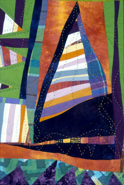100% cottons. Machine pieced using no patterns or straight edges, hand quilted with perle cotton.